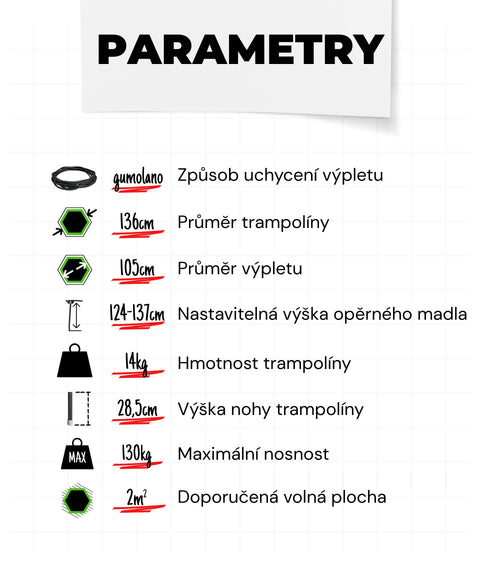 Volba číslo jedna pro výplet na trampolínu po celém světě na základě kvality, výkonu, odolnosti a hodnoty. Tato tkanina vyrobená z polypropylenu a karbonových vláken má vysokou pevnost v tahu, vynikající UV ochranu a je odolná vůči plísním a vodě. Vlákna jsou tepelně propojena, aby poskytovala hladší, stabilizovaný povrch, který vydrží neustálé prohýbání a namáhání. Tento materiál se však neroztahuje; místo toho tlumí spoje a zároveň poskytuje pevný a stabilní povrch. Výplet trampolíny se vždy vrací do své rovné polohy a nemačká se ani neskládá. Doskočná plocha je ohraničena lemem, jehož šířka je 5 cm. Trampolína STANDARD má 60 ok, kterými je provlečeno gumolano.