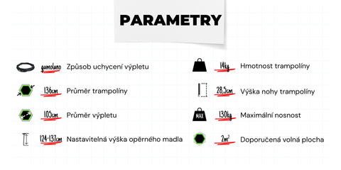 Konstrukce této trampolíny je vyrobena z materiálu nejvyšší kvality, a to z ocelového kulatého profilu, jehož 2 mm tloušťka stěny zajišťuje vysokou pevnost a tuhost. Součástí konstrukce je také 6 pevných nohou, které jsou zakončené speciálním gumovým nástavcem. Tento nástavec nezanechává šmouhy a chrání před poničením všech druhů povrchů. Nohy trampolíny jsou vysoké 28,5 cm. Nosnost trampolíny je až 130 kg, přitom její hmotnost nepřesáhne 14 kg.