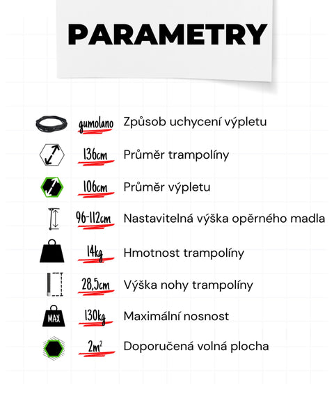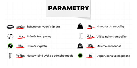 Konstrukce této trampolíny je vyrobena z materiálu nejvyšší kvality, a to ocelového kulatého profilu, jehož 2 mm tloušťka stěny zajišťuje vysokou pevnost a tuhost. Součástí konstrukce je také 6 pevných nohou, které jsou zakončené speciálním gumovým nástavcem. Tento nástavec nezanechává šmouhy a chrání před poničením všech druhů povrchů. Nohy trampolíny jsou vysoké 28,5 cm. Nosnost trampolíny je až 130 kg, přitom její hmotnost nepřesáhne 14 kg.